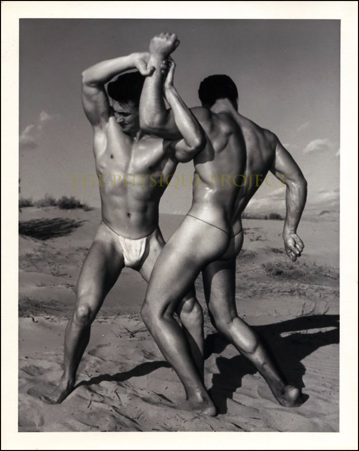 Late 1940s or early 50s location photo by Bruce, featuring bodybuilders Bert Elliott and John Murphy.