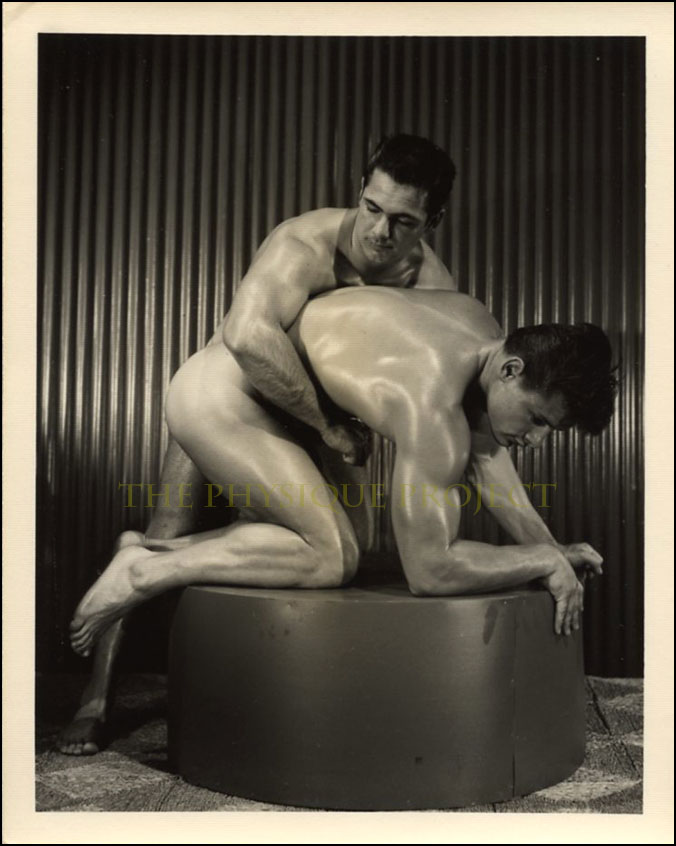 Flawless, late 1940s photo from Bruce Bellas, featuring a pair of nude male models in a classic wrestling tableaux. Great composition, beautiful lighting and a fine print.