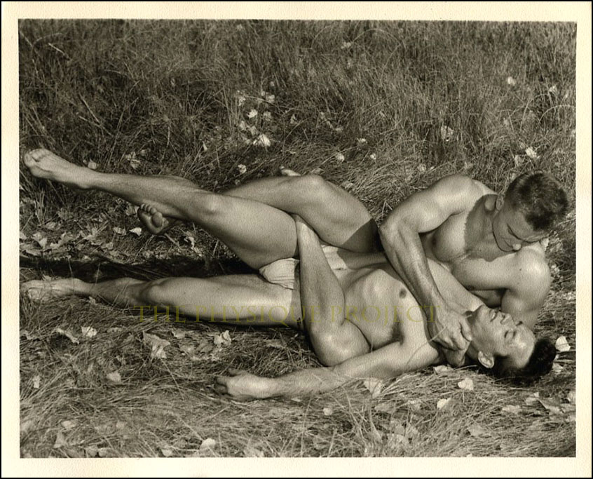 Classic duo image from the Extra Wrestling Set by Don Whitman, late 1940s or early 1950s vintage featuring well known models Jim Drinkward and Keith Lewin on location.