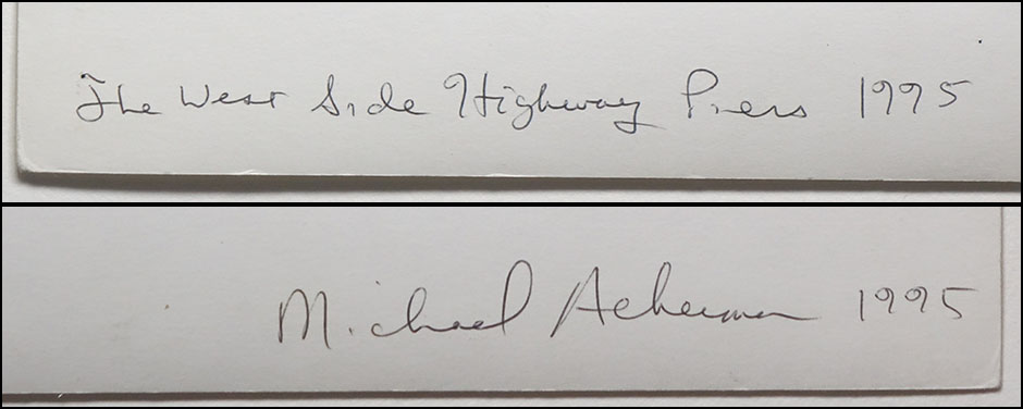 The image offered here is titled "The West Side Highway Piers" (1995 NYC) which features a pretty typical view of activity on the piers with dozens of people lounging, tanning, socializing or getting some head. This well represents the last gasp of the original, unrenovated piers which were often times only accessible by getting through the chain link fences that barricaded them. The print is titled, signed and dated to the reverse, lower left and lower right.