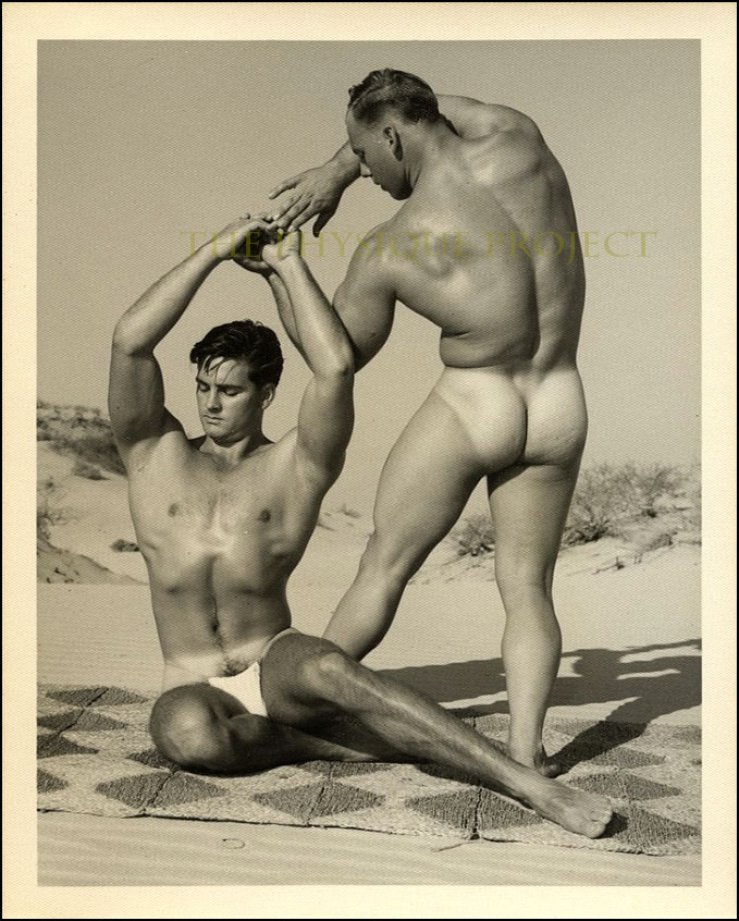 Artfully composed photo featuring beefy musclemen Marve McPike and Bob Poling at an unknown location, late 1940s vintage.