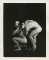 Vintage Battling Duo Male Physique Photograph Bruce of Los AngelesTerrific battle pose image of two models in this studio shot by Bruce, giving a nod to classic sculpture. Circa late 1940s/early 1950s. Size/Condition: 4"x 5", silver gelatin, double weight, fiber based print. In excellent condition with light age toning and oxidation in shadow tones. Stamped to the reverse with the early "Bruce Los Angeles" mark, and series number 22-4. Undated. Purchase price includes domestic insured Priority Mail shipping, First Class for international orders. Follow us on Instagram (@thephysiqueproject) and X/Twitter (@PhysiqueProject) for inventory updates. |