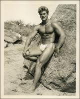 Bruce Of Los Angeles Vintage Bud Counts Bodybuilder Physique PhotographClassic physique imagery in this late 1940s/early 1950s photograph of beefy Bud Counts, presumably at a seaside locale. Size/Condition: Measures 4”x 5”. Silver gelatin, double weight fiber paper with pebble finish. Excellent condition w/age toning and slight fiber paper wave. Early Bruce Los Angeles stamp with series number 15-3 to reverse, undated. Purchase price includes domestic insured Priority Mail shipping, First Class for international orders. Follow us on Instagram (@thephysiqueproject) and X/Twitter (@PhysiqueProject) for inventory updates. |