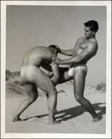 Bruce of Los Angeles Vintage B&W Male Wrestling Duo PhotographFine vintage photograph by Bruce of LA, featuring an unknown pair of models in a classic wrestling image. Wonderful seaside location. Circa late 1940s/early 1950s. Size/Condition: 4"x 5", silver gelatin, double weight, fiber based print. In excellent condition. Stamped to the reverse with the early "Bruce Los Angeles" mark, and series number 28-5. Undated. Purchase price includes domestic insured Priority Mail shipping, First Class for international orders. Follow us on Instagram (@thephysiqueproject) and X/Twitter (@PhysiqueProject) for inventory updates. |