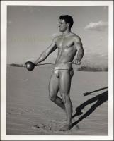 Bud Counts B&W Male Physique Studio Photograph Bruce of LAClassic late 1940s imagery by Bruce of Los Angeles. This is a terrific early image from the photographer with fave model man Bud Counts in a simple studio shot, holding a sword...the perfect lighting showcasing his thick, muscular body. Size/Condition: 4"x 5", doubleweight, silver gelatin fiber print with pebble finish. Minor age toning, bit of discoloration to reverse (negligible). Stamped with the two line Bruce Los Angeles stamp to reverse, with code 25-11. Undated. Purchase price includes domestic insured Priority Mail shipping, First Class for international orders. Follow us on Instagram (@thephysiqueproject) and X/Twitter (@PhysiqueProject) for inventory updates. |