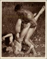 Dardanis & Friend WPG Location Male Duo Vintage B&W Physique PhotographJim Dardanis clearly has the upper hand against his (unknown) opponent in this image by Don Whitman. Size/Condition: 5"x 4". Printed on a double weight, fiber paper with a textured surface. In excellent condition with light fiber paper wave. Stamp marked Extra Wrestling Set Series 21 No 7-6 and the early WPG (pre-zip) logo to reverse, undated. Purchase price includes domestic insured Priority Mail shipping, First Class for international orders. Follow us on Instagram (@thephysiqueproject) and X/Twitter (@PhysiqueProject) for inventory updates. |